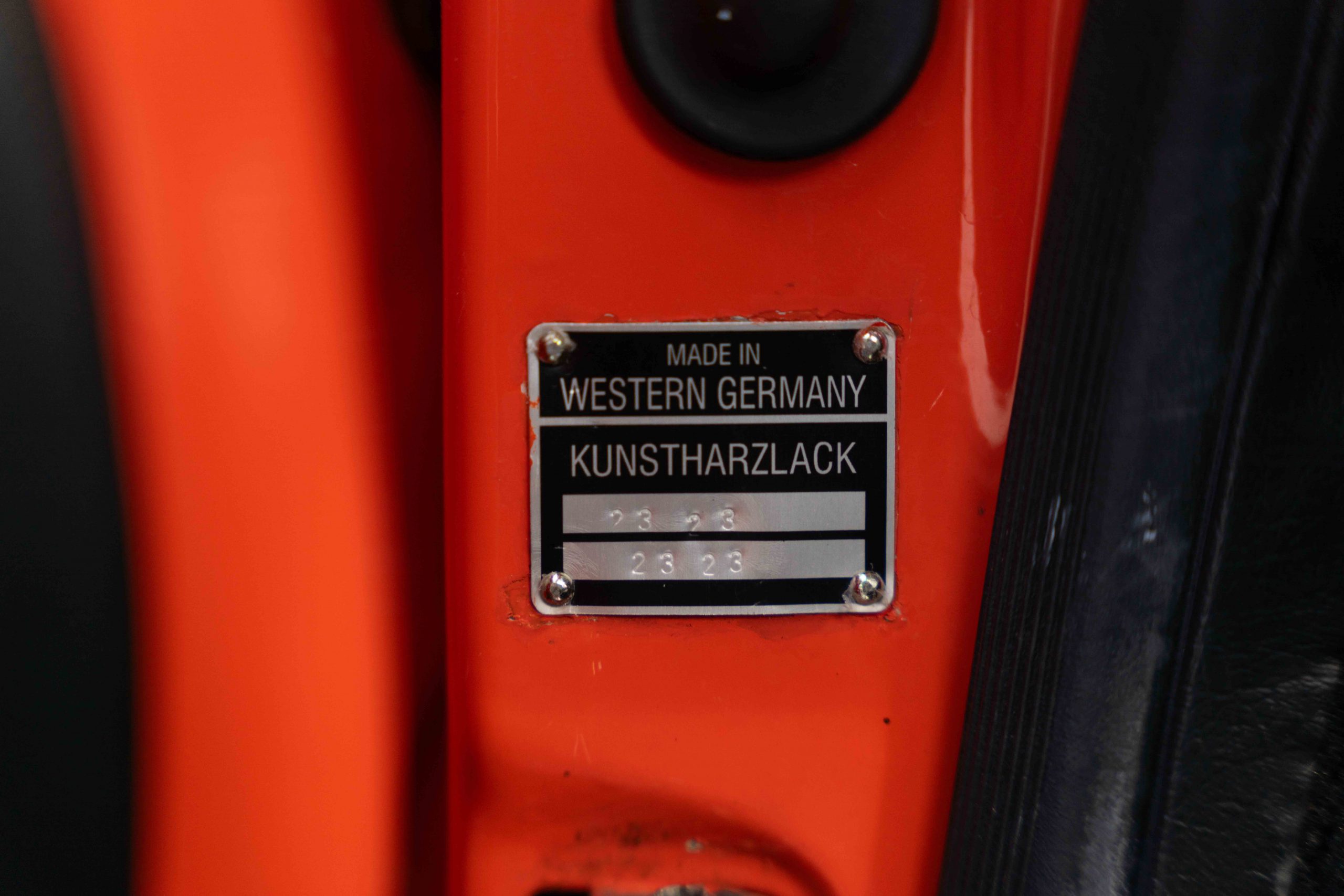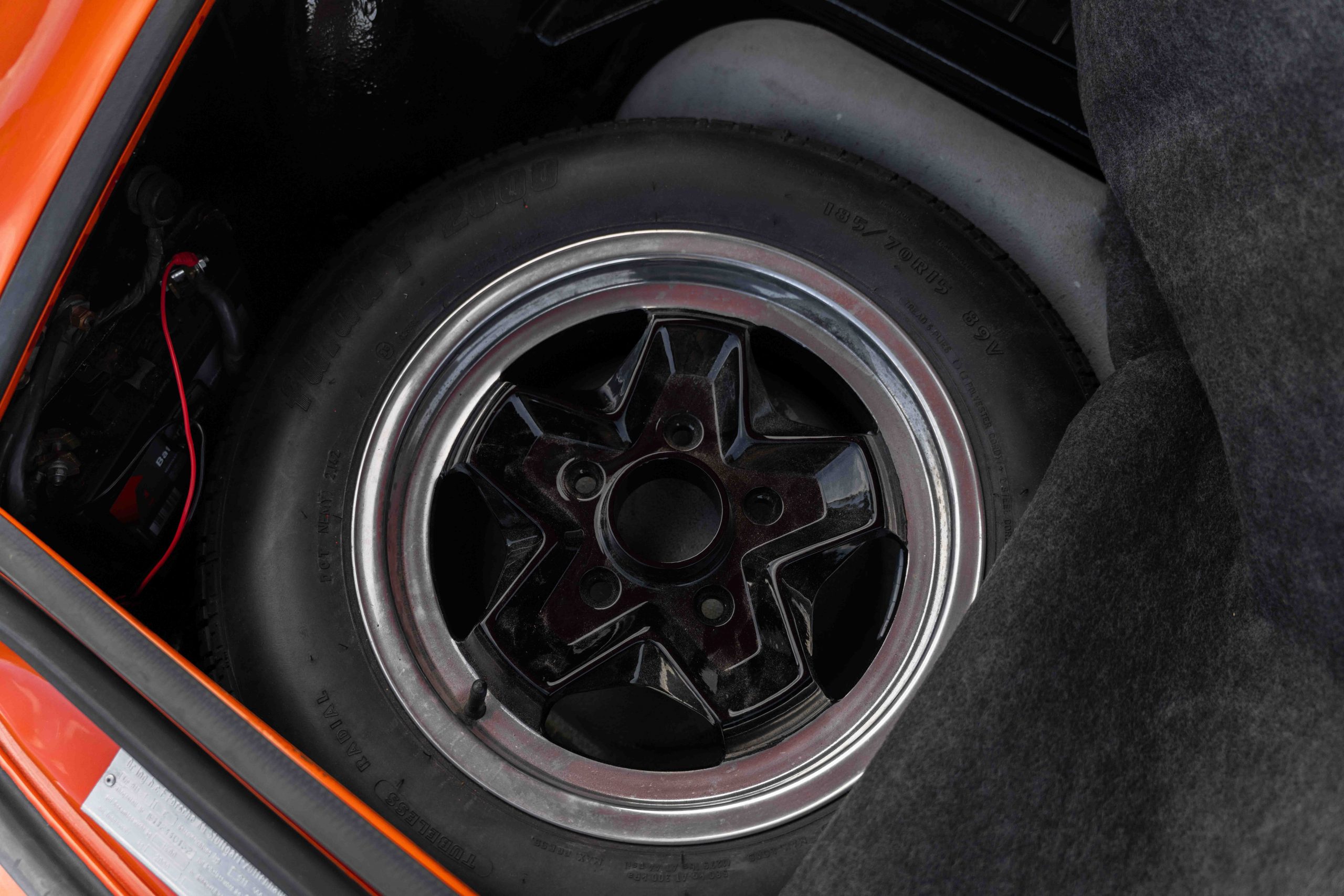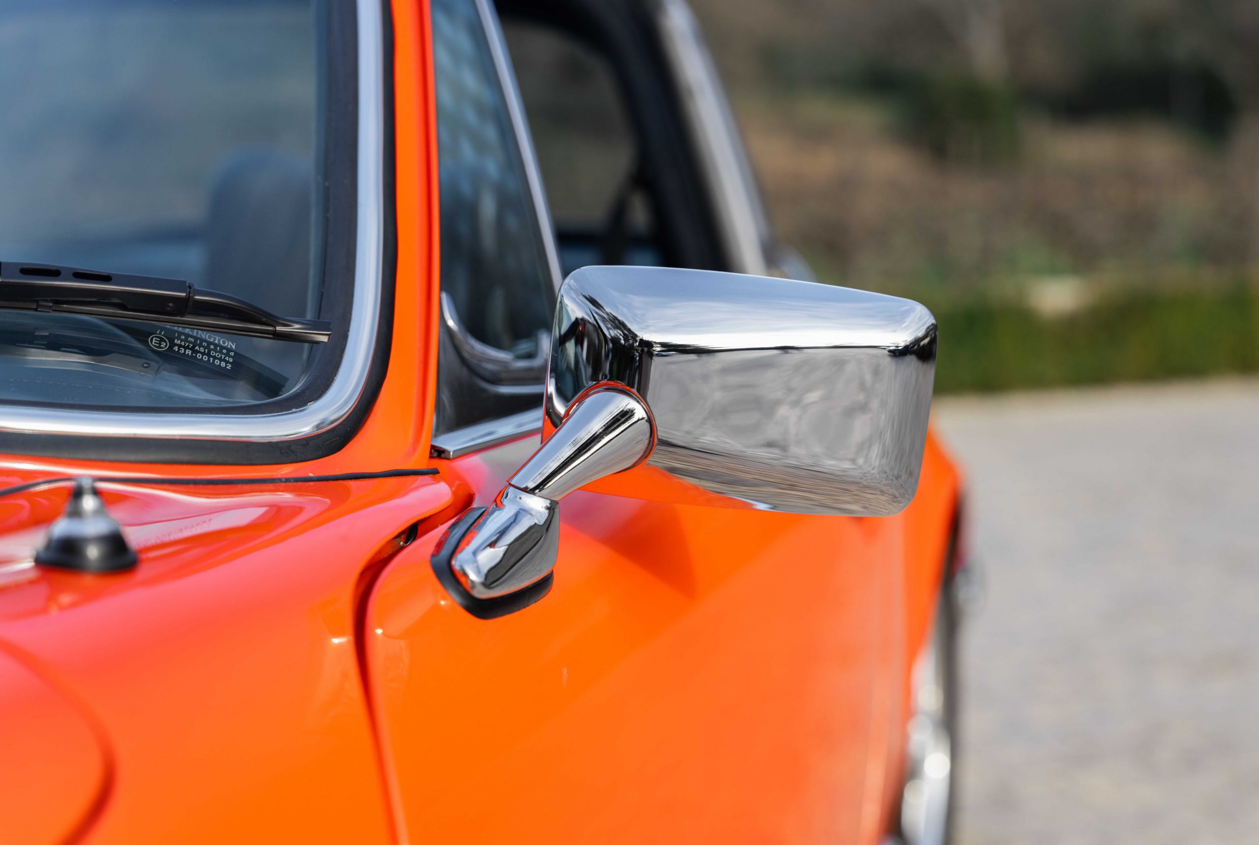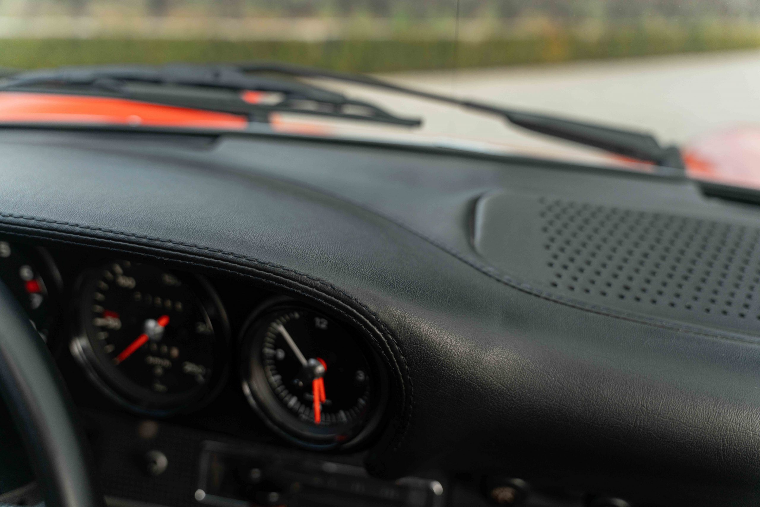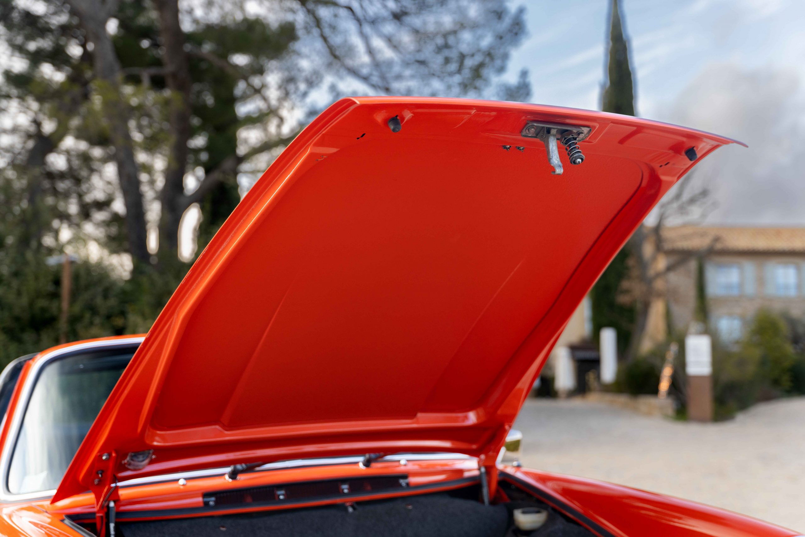 La carrosserie est tout simplement superbe. La teinte orange, emblématique et particulièrement recherchée, met parfaitement en valeur les lignes intemporelles de ce modèle. La peinture présente un très bel éclat et une homogénéité remarquable. La face avant est saine et exempte de défauts notables. Les jantes Fuchs sont en très bon état et s’accordent parfaitement avec la configuration du véhicule. Les optiques, les chromes ainsi que les ajustements de carrosserie sont en excellent état.
