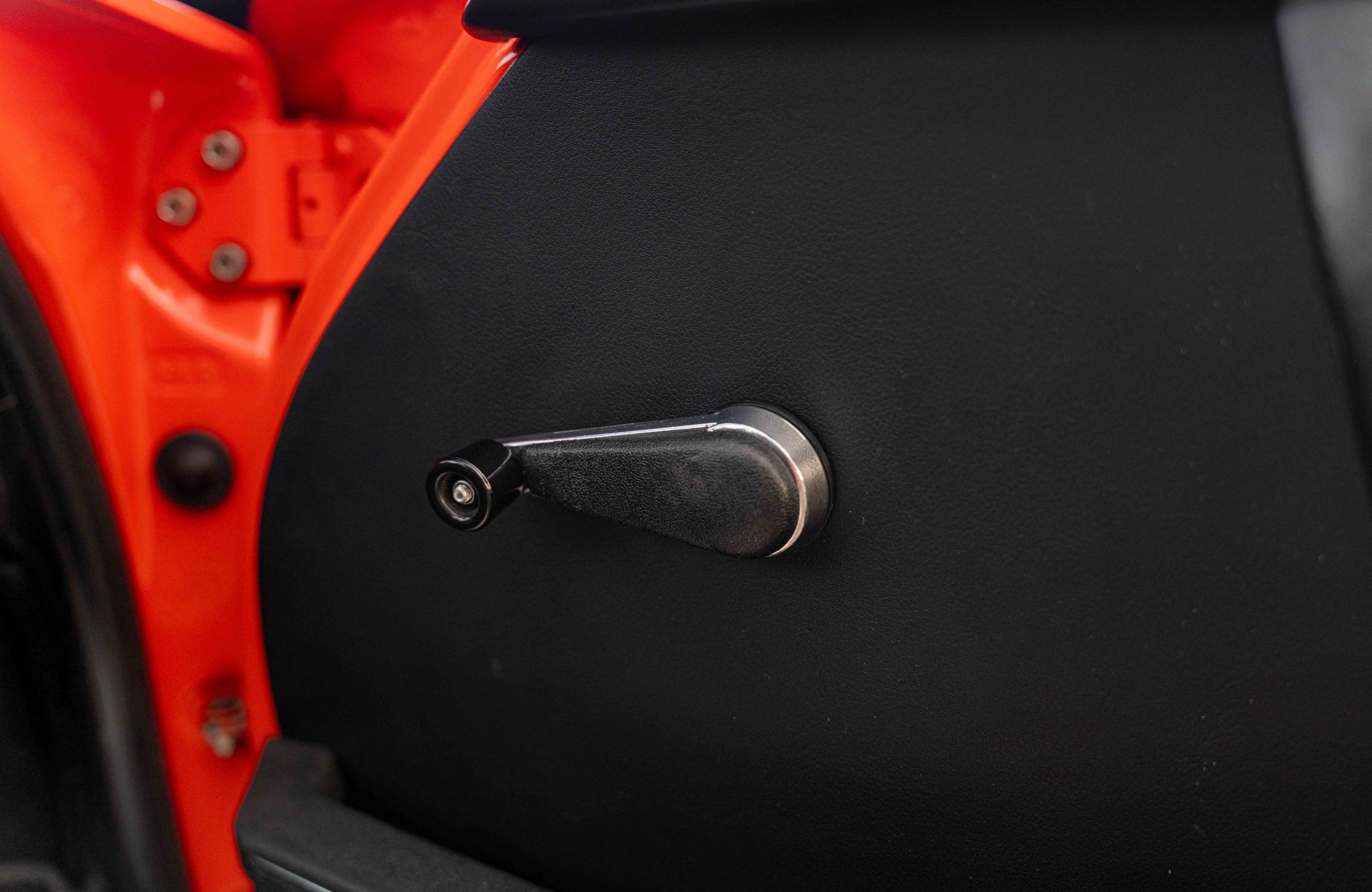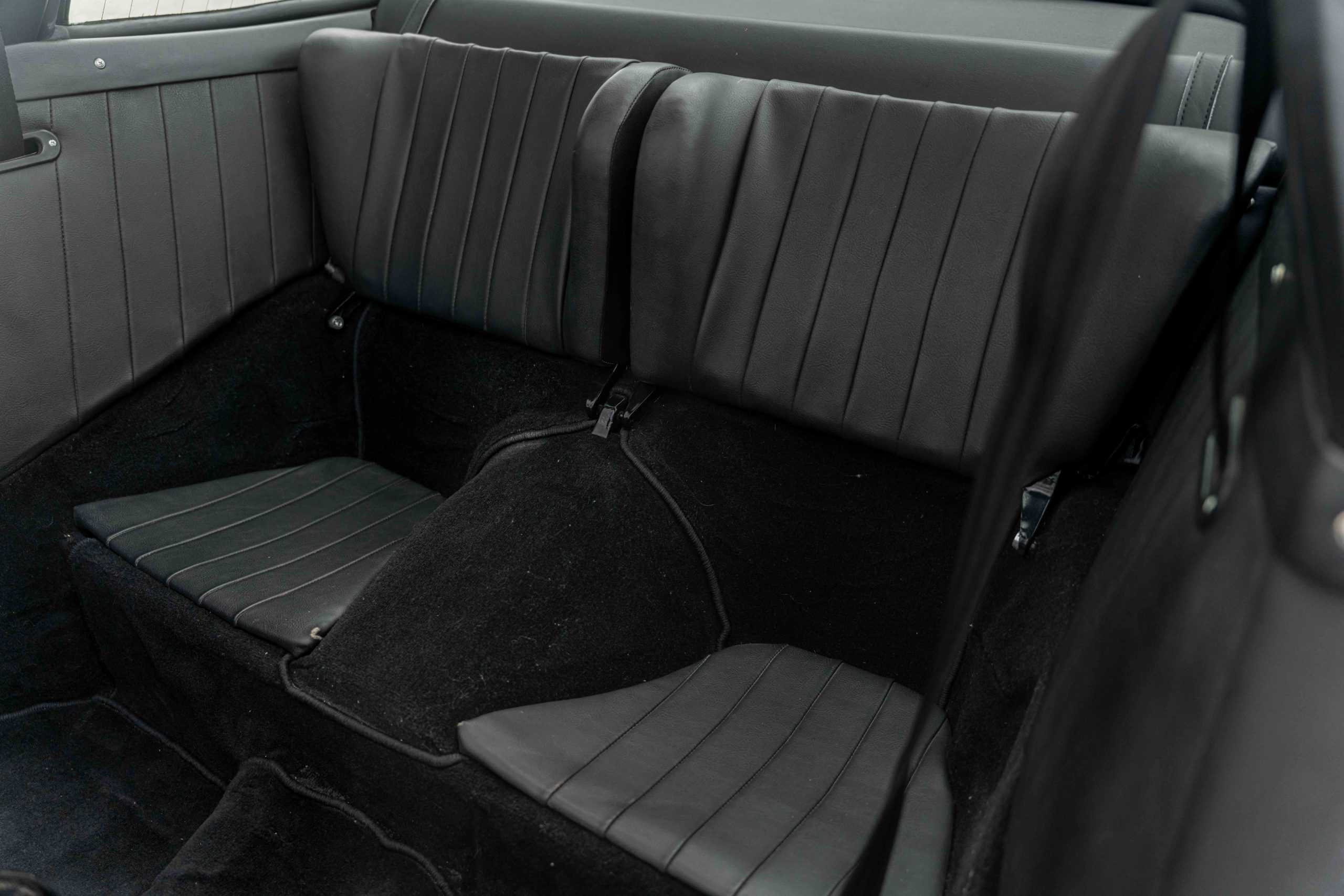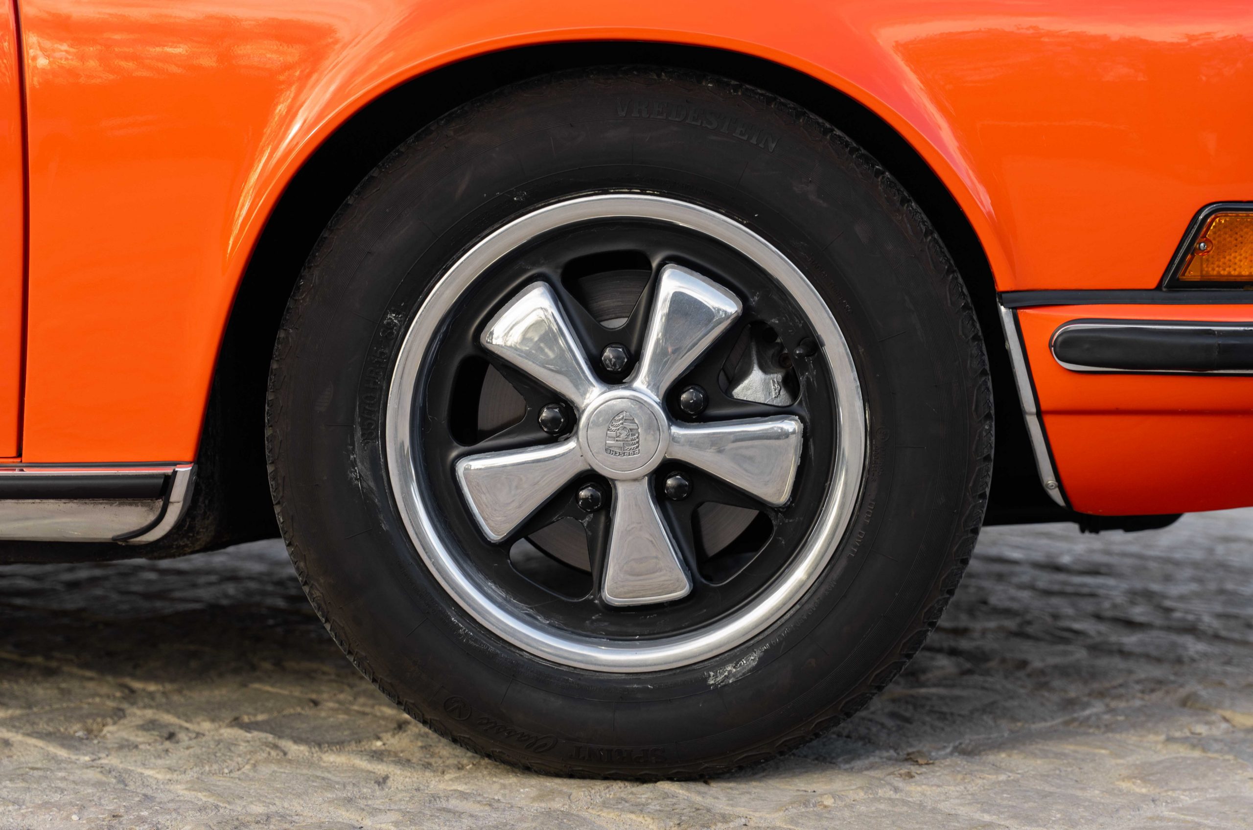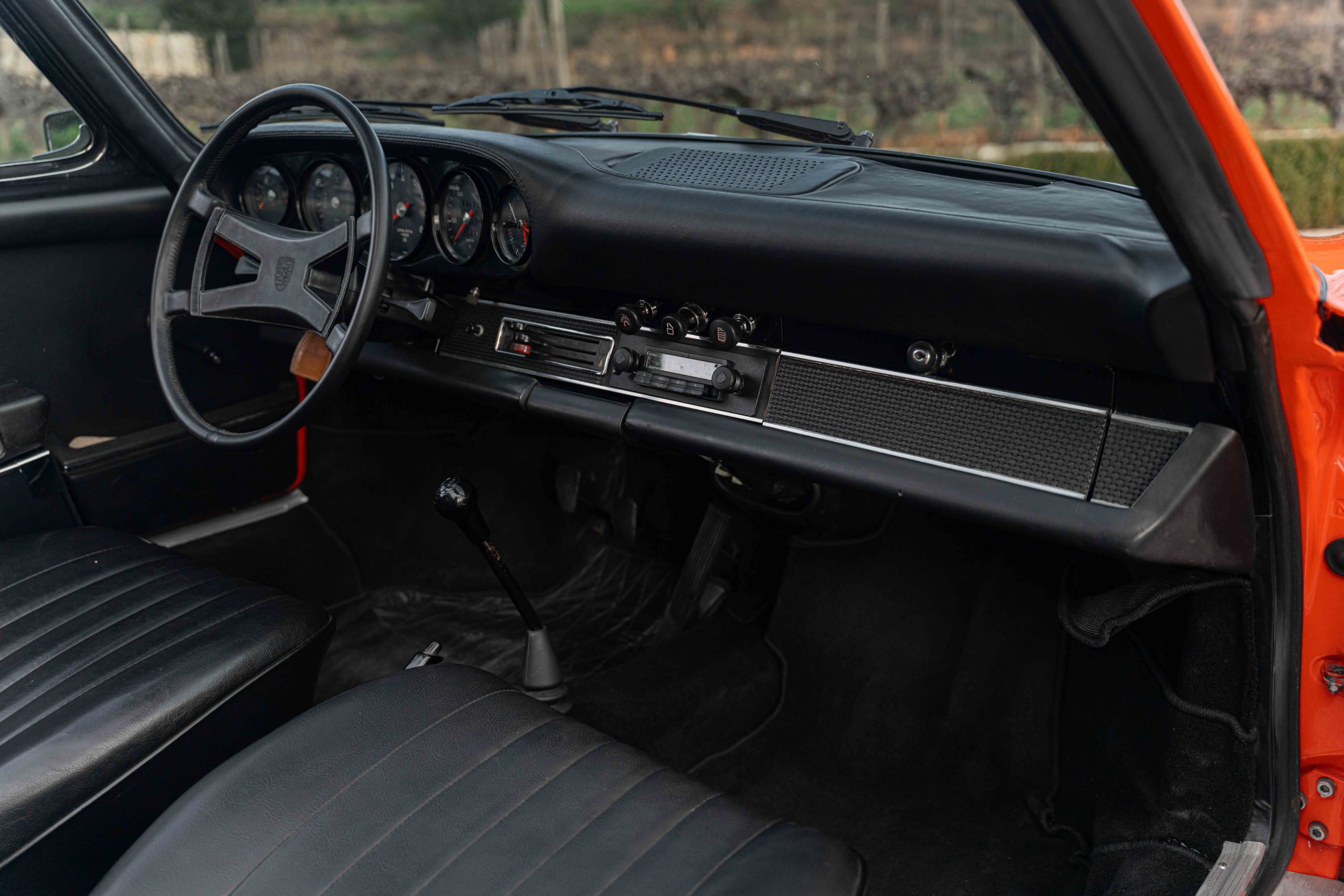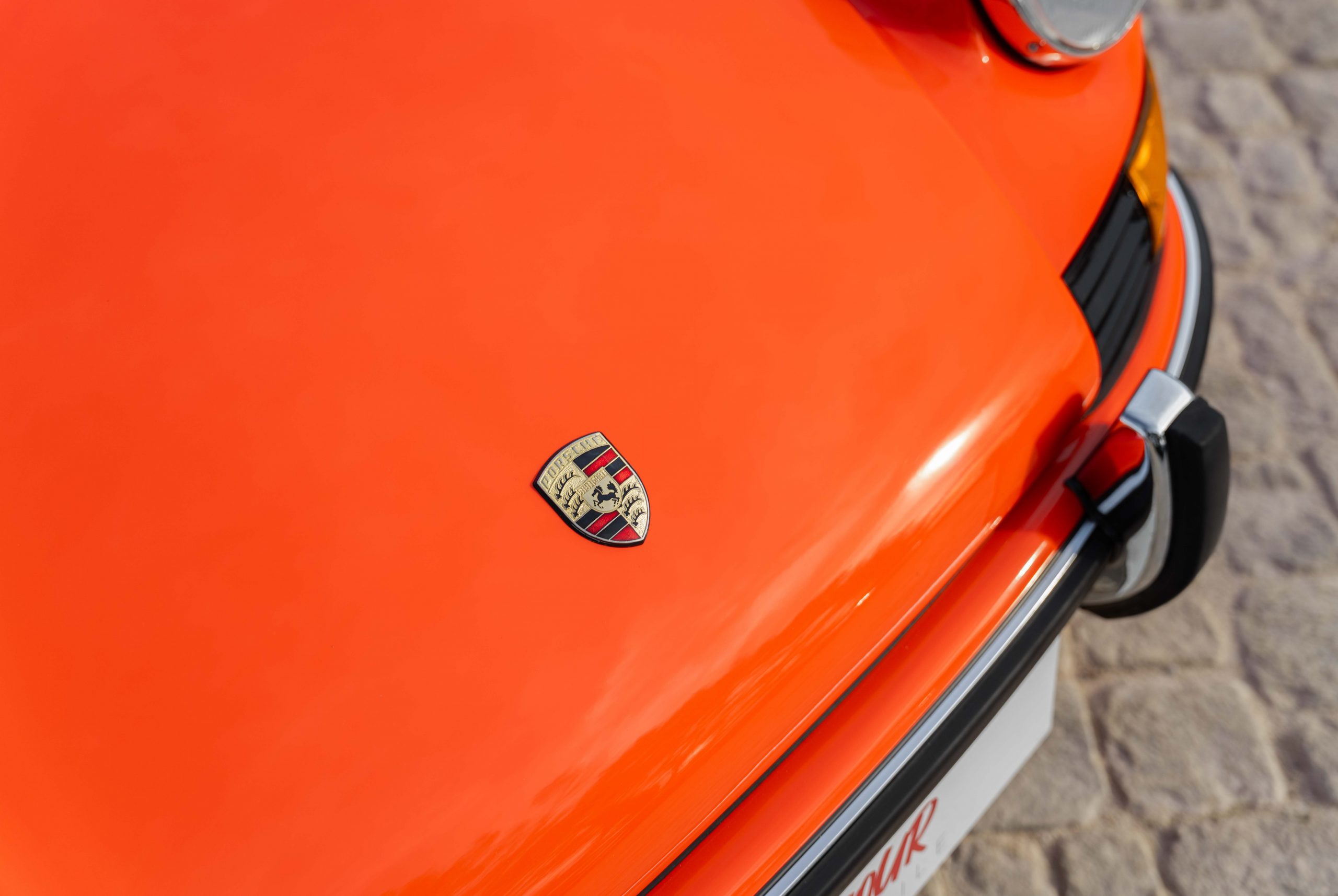 La carrosserie est tout simplement superbe. La teinte orange, emblématique et particulièrement recherchée, met parfaitement en valeur les lignes intemporelles de ce modèle. La peinture présente un très bel éclat et une homogénéité remarquable. La face avant est saine et exempte de défauts notables. Les jantes Fuchs sont en très bon état et s’accordent parfaitement avec la configuration du véhicule. Les optiques, les chromes ainsi que les ajustements de carrosserie sont en excellent état.