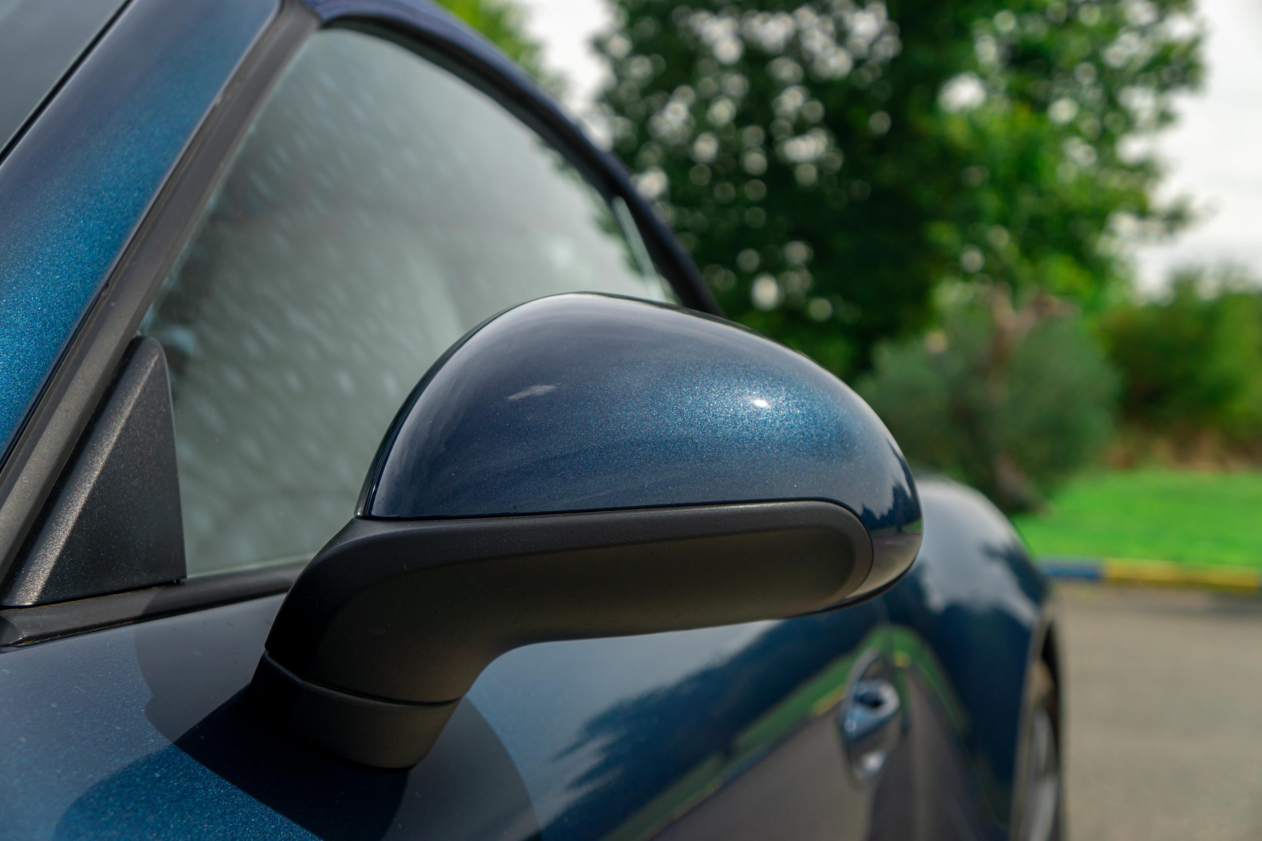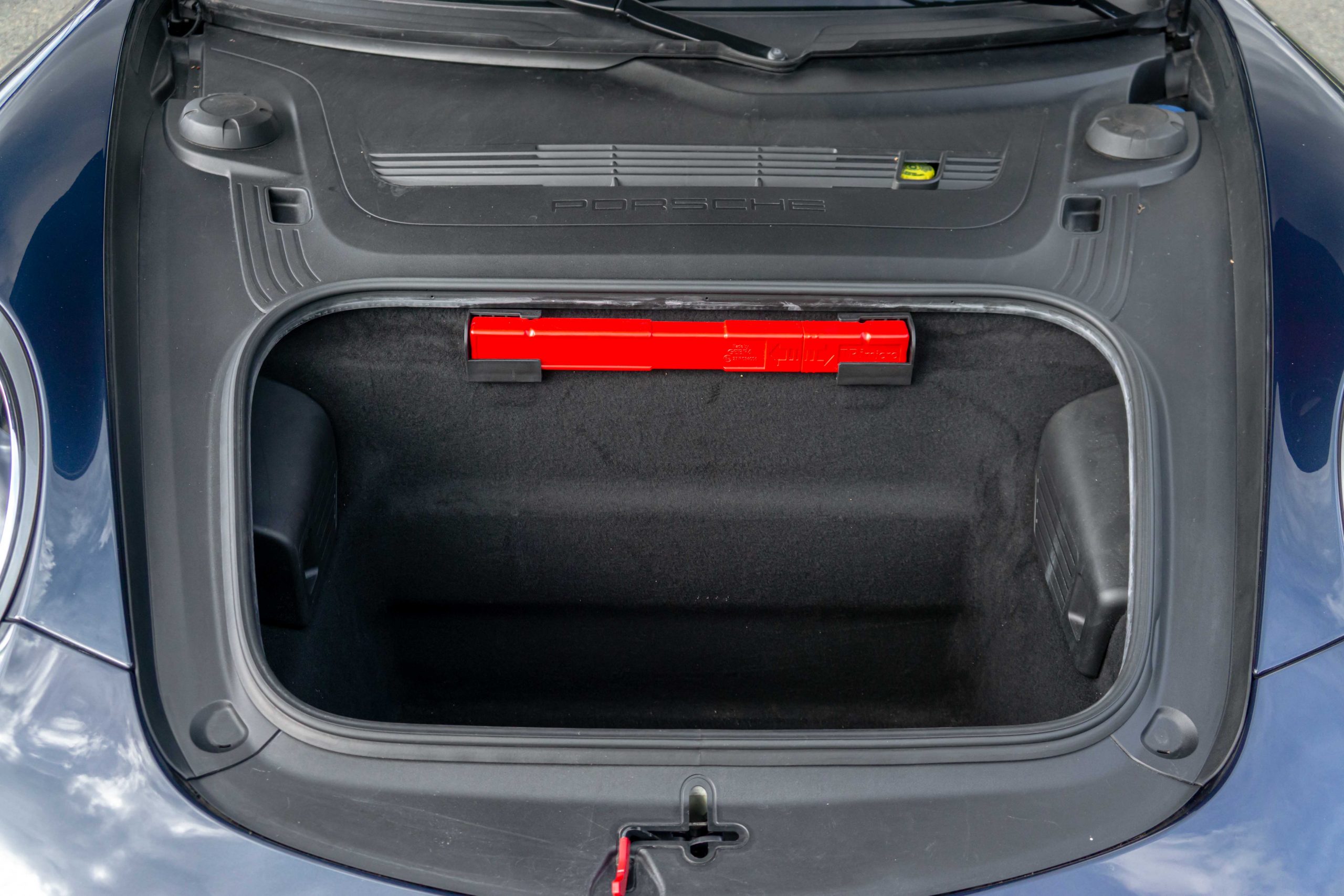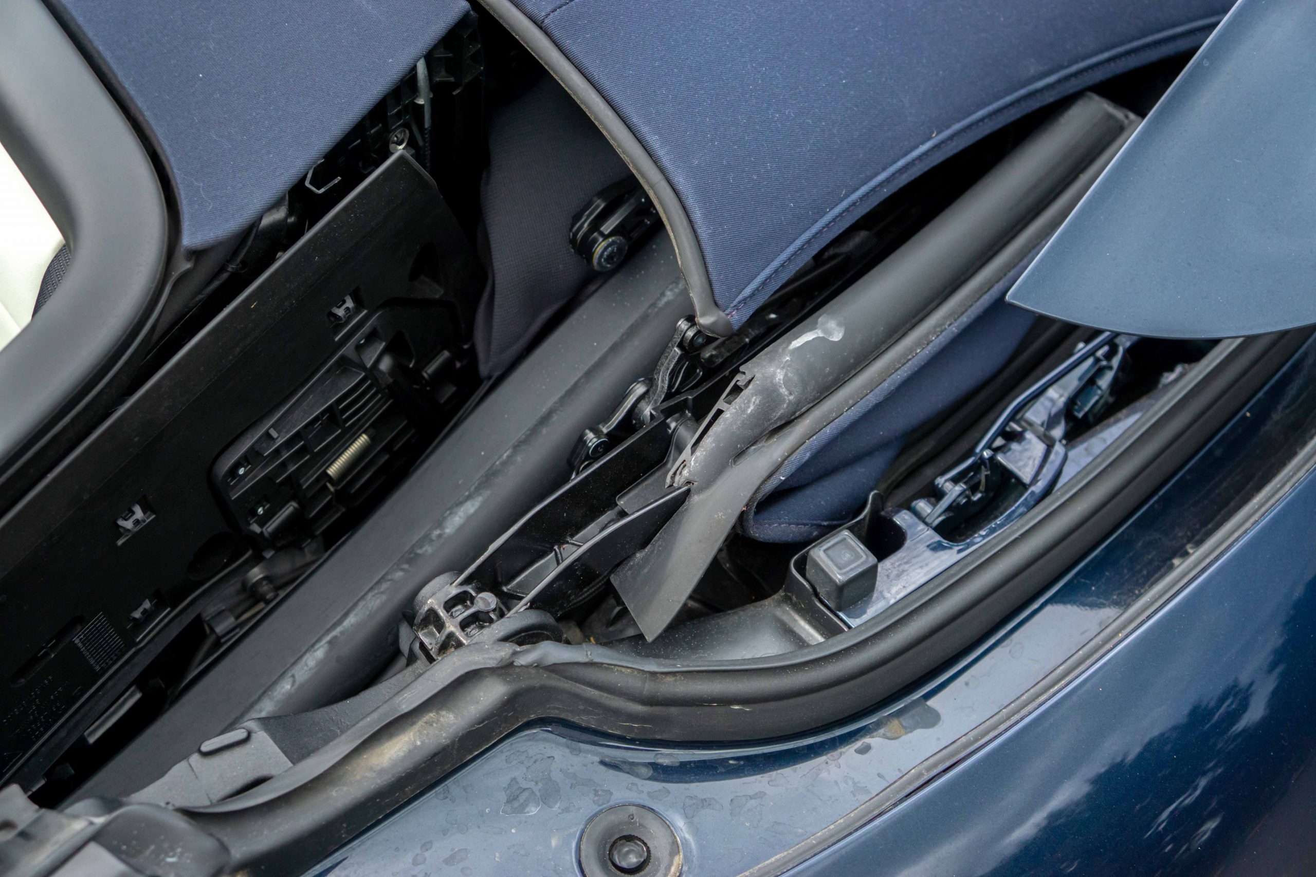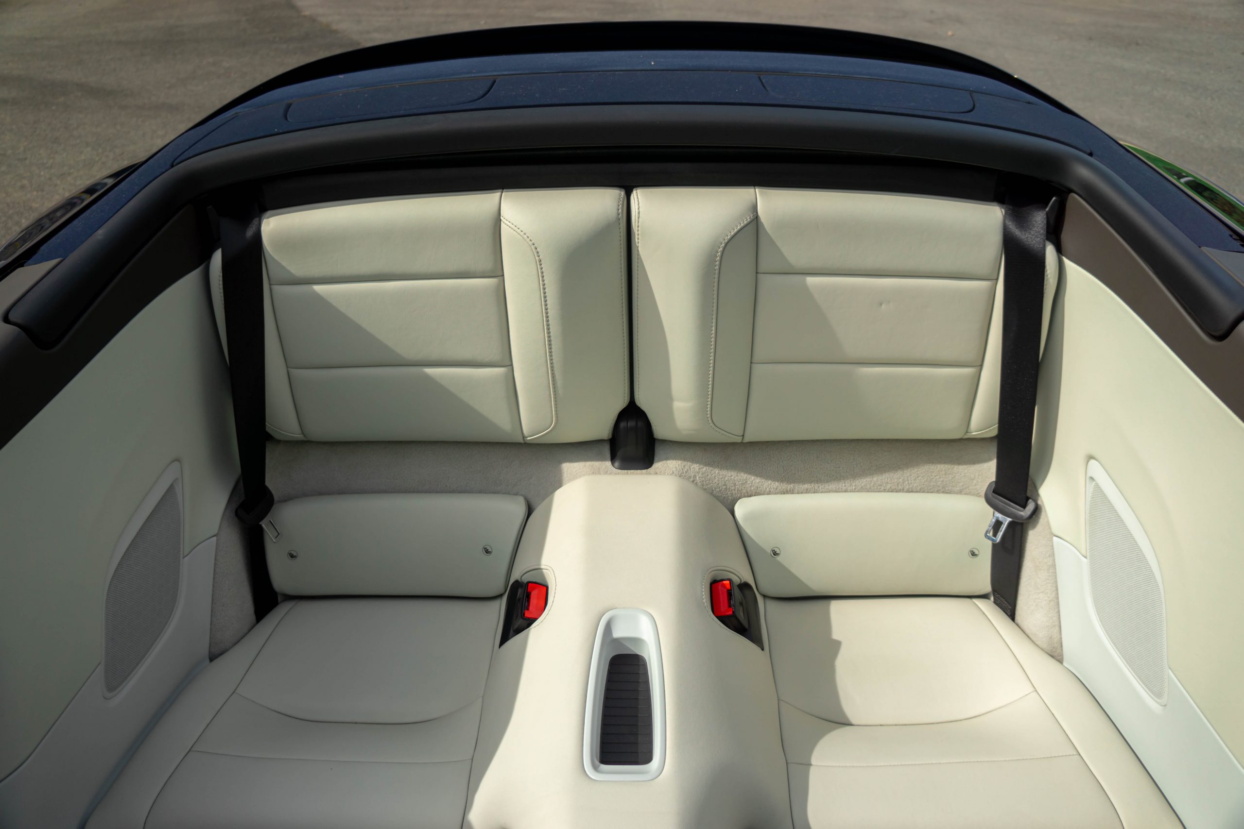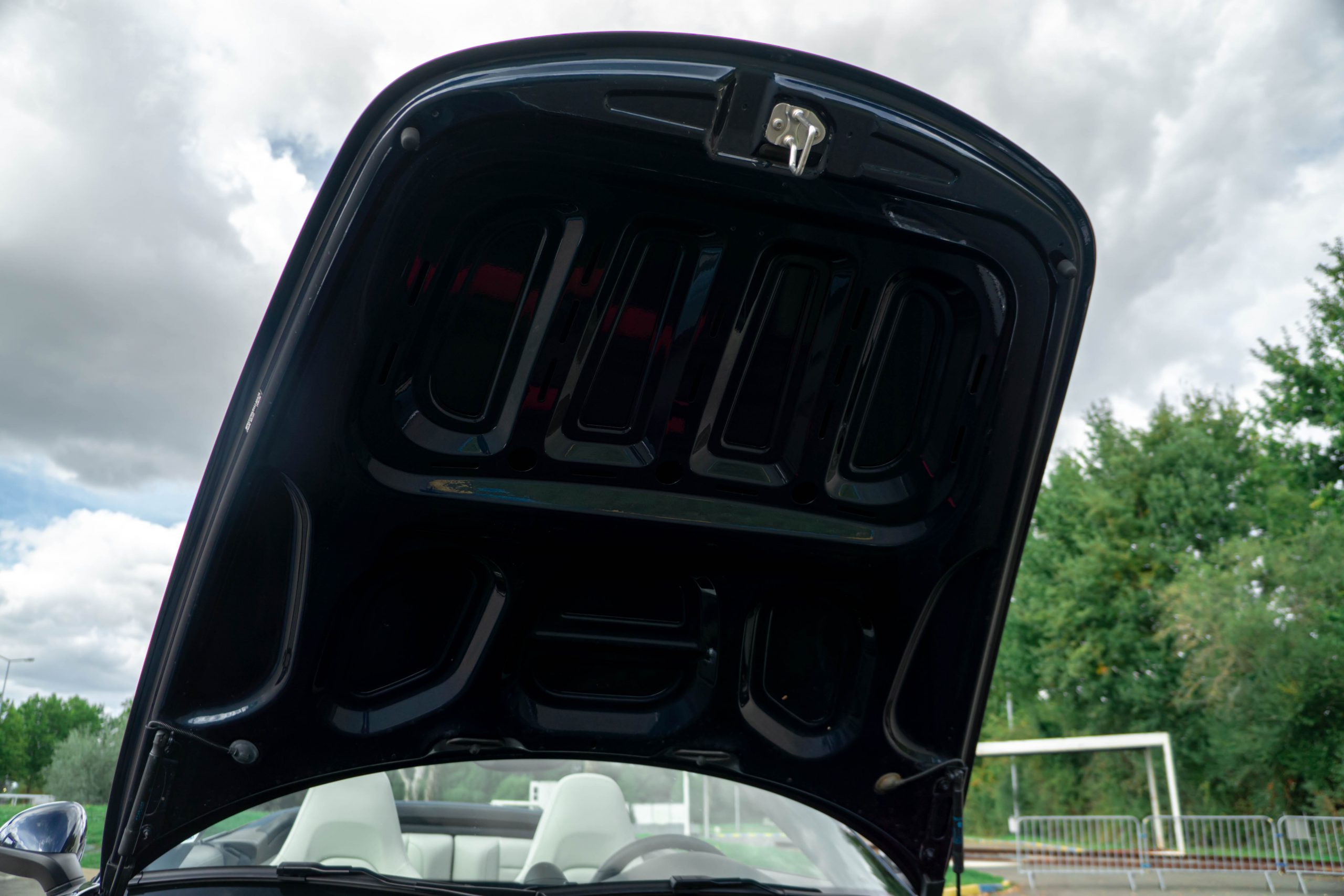 L’extérieur présente bien, la couleur est profonde et se marie à merveille avec l’interlude. Très peu d’impacts sont à signaler sur la face avant. Les deux jantes arrières sont légèrement touchées. La capote est en parfait état et le mécanisme fonctionne parfaitement. Les optiques et le pare-brise ne présente aucune impacts.